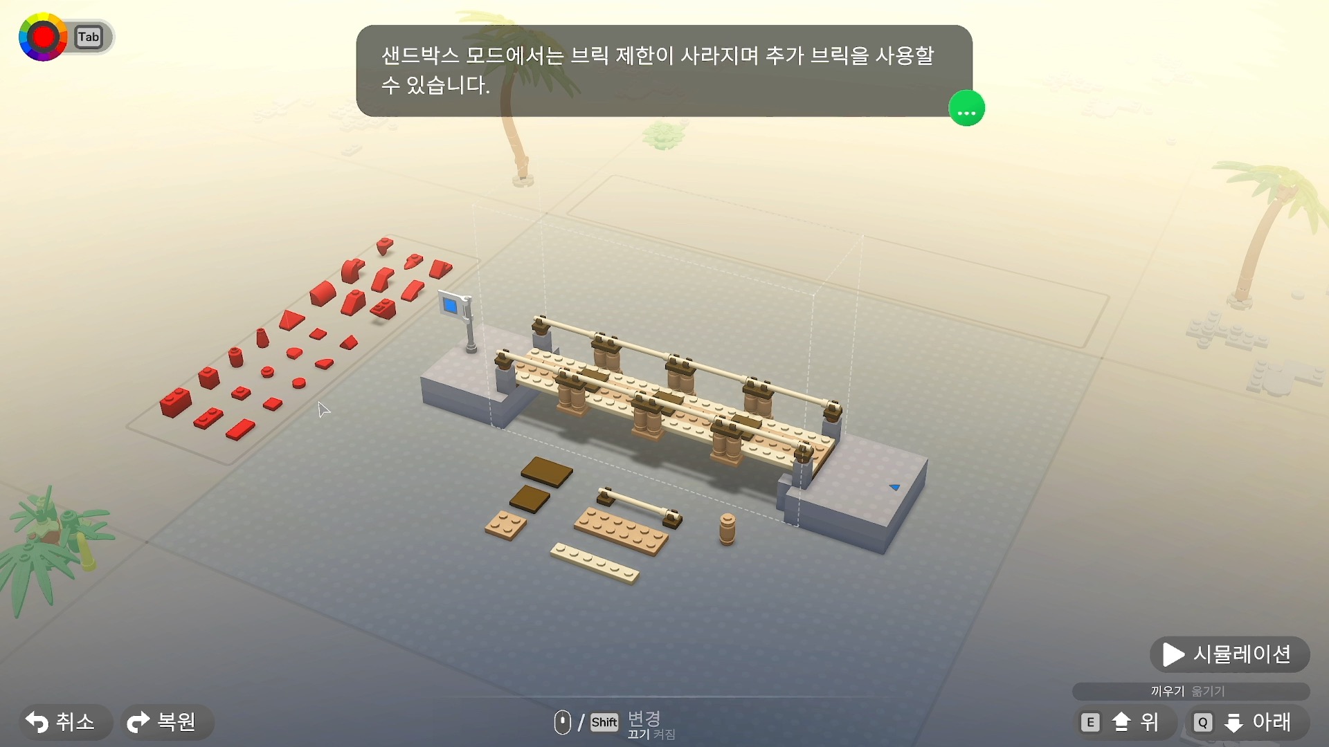 또 만약 시뮬레이션을 통과하고 퍼즐을 해결 했다면 다시 돌아가 샌드박스 모드를 진행 할 수 있습니다. 샌드박스 모드는 레고 블럭의 제한이 없이 자신이 원하는 모든 방식의 조립이 가능하며, 게임을 진행하면서 모은 재화를 통해 샌드박스 블럭을 구매해 더 다양한 블럭을 추가 할 수 있습니다.